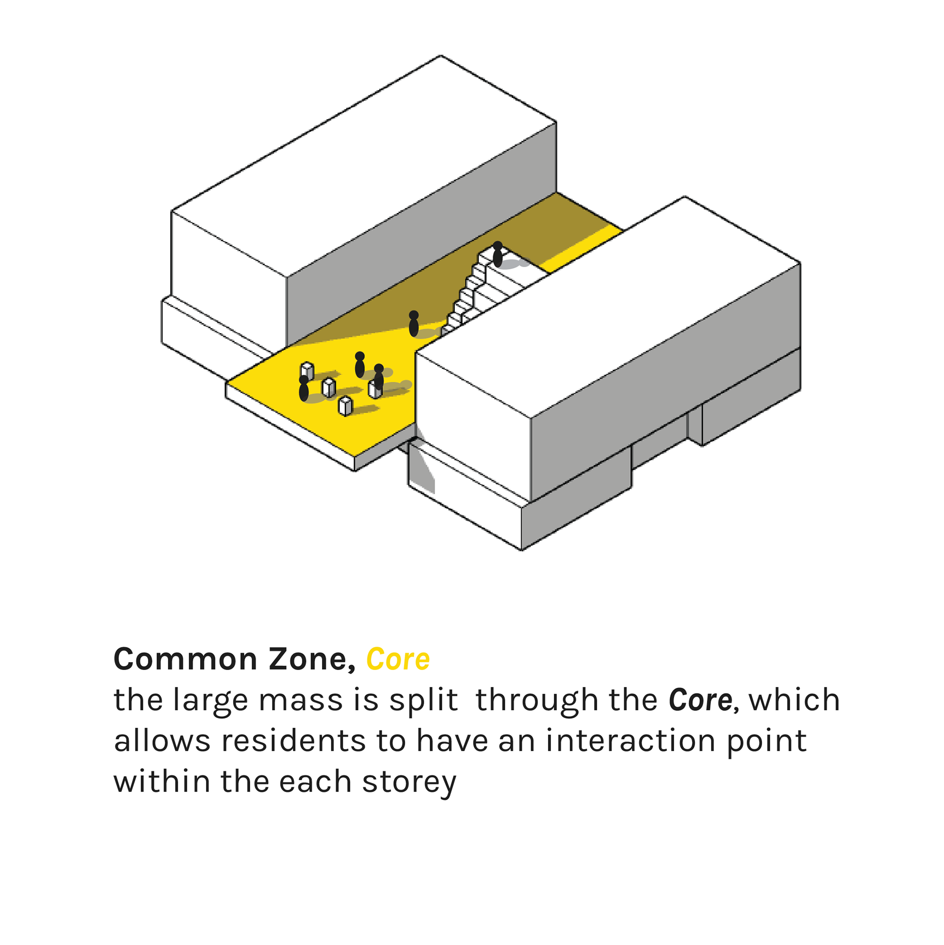 Die Korridore dienen als Straßen, auf denen sich die Nachbarn treffen und unterhalten. Diese Gänge führen zum zentralen Core. The Core befindet sich im Treppenhaus der vertikalen Erweiterungen und fördert soziale Interaktionen in den regelmäßigen Aktivitätsmustern der Nutzer. Jede Ebene eines jeden Gebäudes hat ihren multifunktionalen Core. Dieser dient als gemeinsamer Wohnbereich und Wintergarten für die bisherigen und neuen Bewohner des Wohnhauses. Er funktioniert auch als Atrium, durch das natürliches Licht und Belüftung in die einzelnen Wohnungen durch Fenster an den Innenverkleidungen der einzelnen Einheiten gelangen.